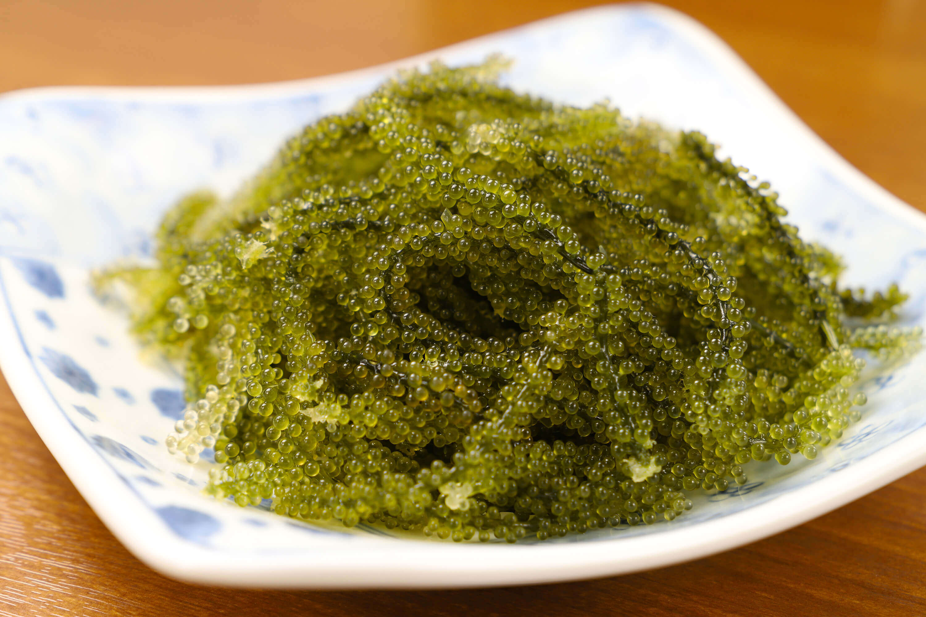 沖縄で人気の海ぶどうですが、久米島が日本一の生産量を誇っています。海藻の仲間である海ぶどうは、茎に付いた小さくて丸いプチプチ食感が特徴。久米島の海ぶどうは、水深612mから取水した海洋深層水も使用し養殖をしています。そのままでももちろん美味しいですが、「南島食楽園」では海ぶどう入りの卵焼きなどいろいろな海ぶどう料理が楽しめます。