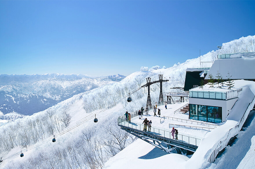 山麓からゴンドラを利用して標高1088mの霧氷テラスまでは約13分。誰でも行けるビュースポットで、水蒸気や霧が霧氷となって煌めく木々や雪に覆われた日高山脈の絶景が広がっています。そこから200mほど先の山腹には、雲の形をした展望デッキのCloud Walk(クラウドウォーク)や、バーカウンターをイメージしたCloud Bar(クラウドバー)があり、こちらも抜群の景観です。