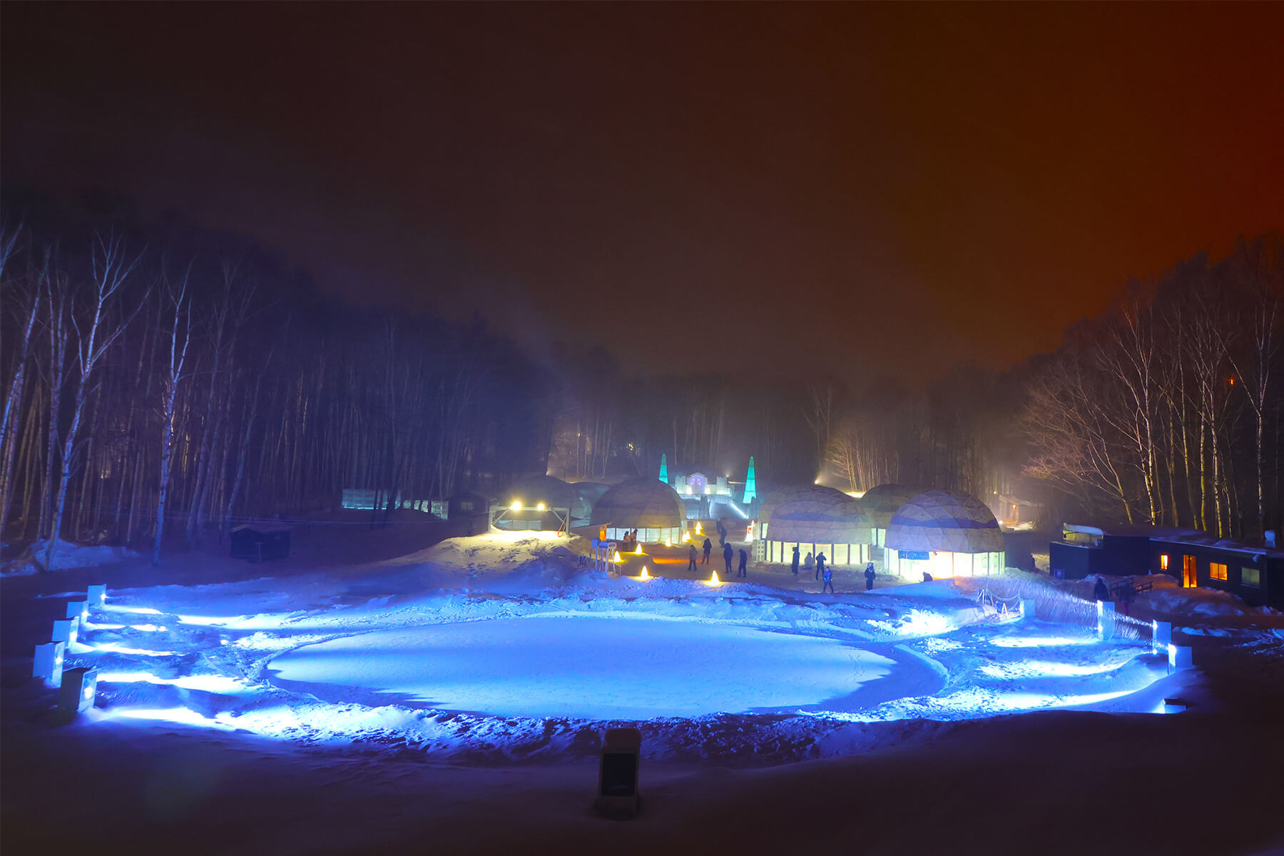 ベッドも棚も全て氷でできている「氷のホテル」は1日1組限定。宿泊体験者は湯船の周りを氷で囲んだ「氷の露天風呂」も利用できます。カウンターやイス、グラスまで氷でできている「氷のBar」は、50種類以上のお酒を提供。継ぎ目のない一枚氷で作られた「氷の教会」や、アイスリンク、氷の滑り台、氷や雪をテーマにしたショップやグルメなど、氷の世界を満喫できます。