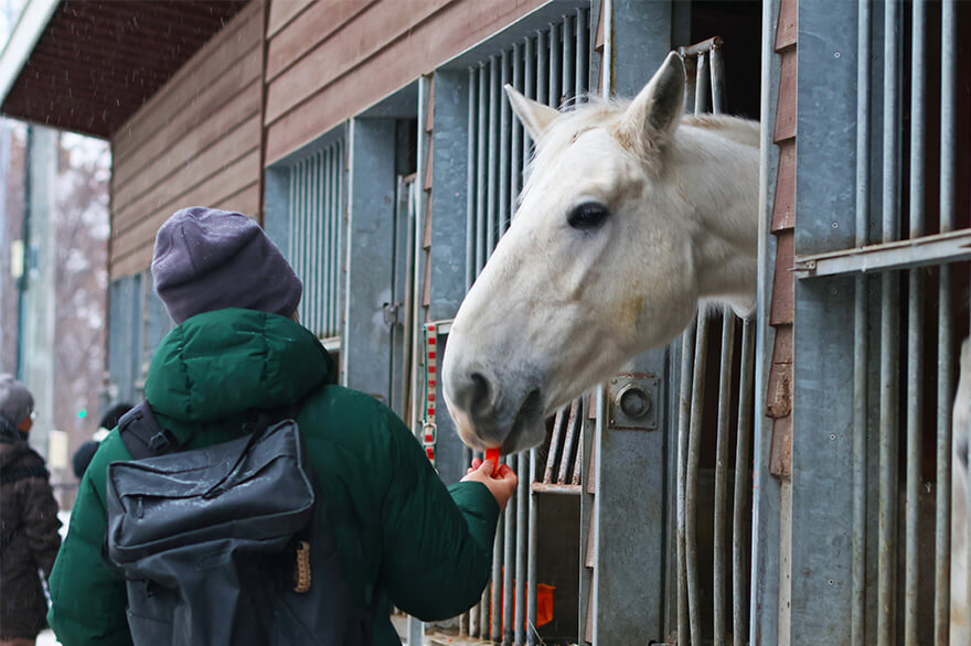 場内には「ふれあい動物園」が併設されていて、ニンジンの餌やり体験や馬たちとの記念撮影もOK。ポニーやウサギ、ヤギなどともふれあえます。
