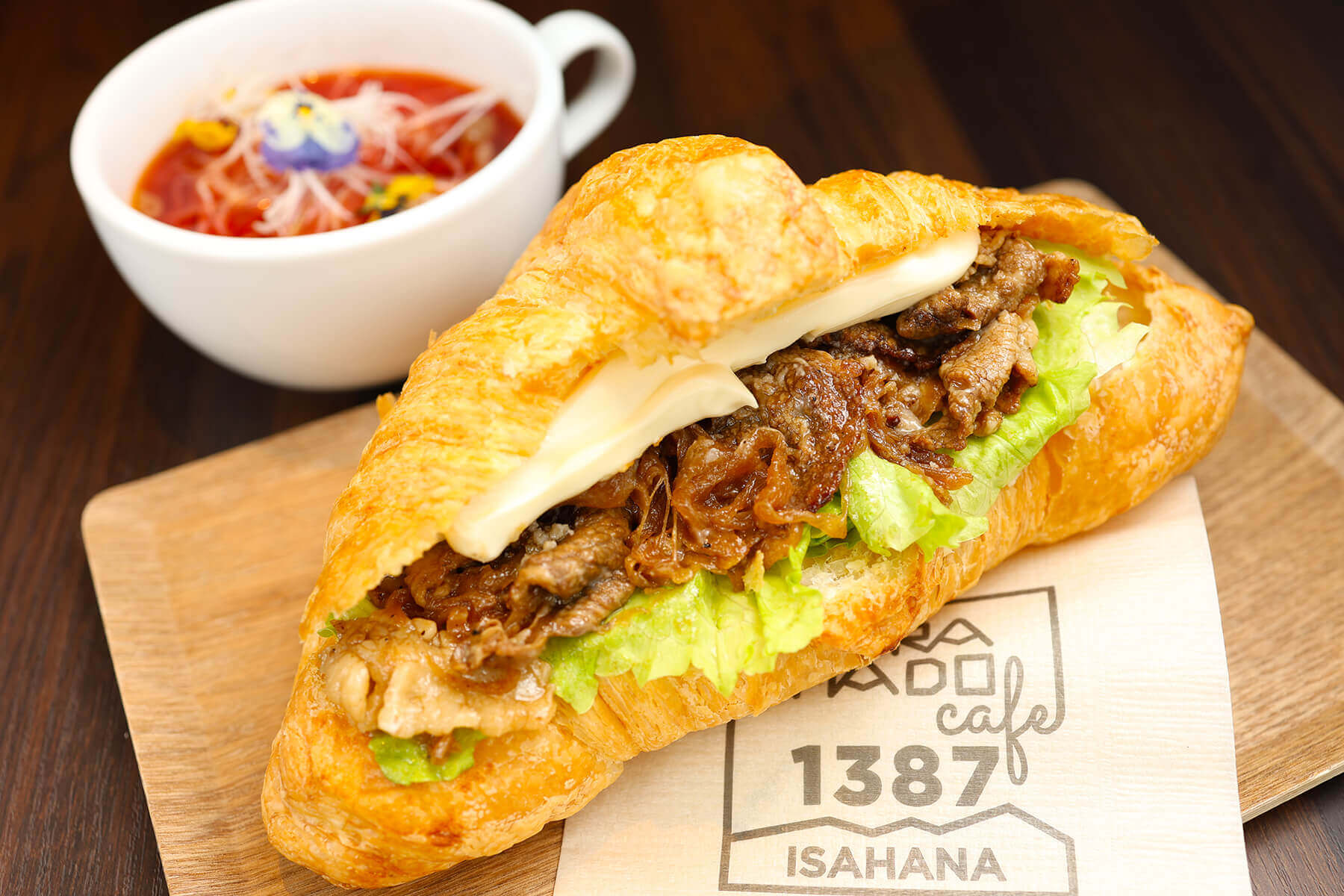 また、広大なスキー場にはレストランが10店舗以上あり、スキーヤーやスノーボーダーのお腹を満たしてくれます。蔵王中央ロープウェイ鳥兜(とりかぶと)駅舎内の「SORAMADO cafe 1387-ISAHANA」では店内で焼くクロワッサンが人気で、驚くほどの特大サイズ。具材はいろいろ選べ、地元食材を使った山形牛やだだちゃ豆サンドなどが味わえます。
