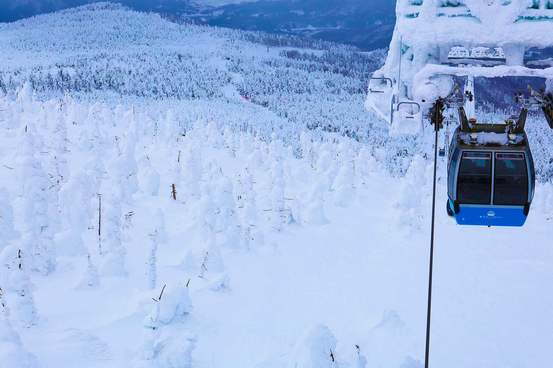 蔵王温泉スキー場で見逃せないのが樹氷の美しさです。この樹氷は、奥羽山脈の一部である蔵王連峰の特殊な気象条件と植生がつくり出した自然現象です。氷点下に水蒸気を多く含んだシベリアからの季節風が、蔵王連峰に自生する常緑針葉樹のアオモリトドマツに付着して凍りつき、大きく成長していきます。限られた地域でしか見ることのできないこの樹氷の見頃は1〜2月。蔵王ロープウェイの山麓線と山頂線を乗り継いで地蔵山頂駅へ向かう途中、360度の樹氷群の大パノラマが望めます。山頂駅にある屋上展望台なども眺望スポットです。