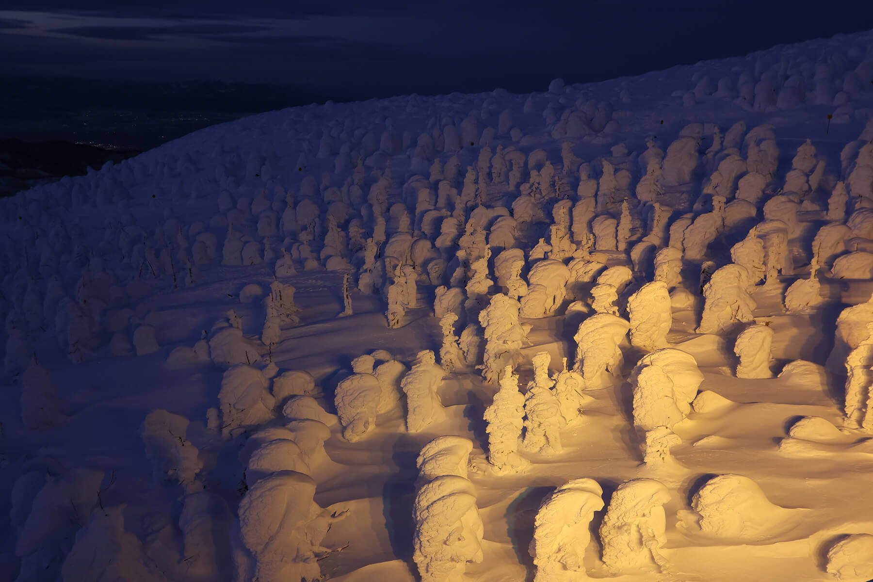 毎年、期間限定のイベントとして、樹氷のライトアップが行われています。暗闇の中、ライトに照らされて浮び上がる樹氷は幻想的で、昼間とは異なる姿を楽しめます。