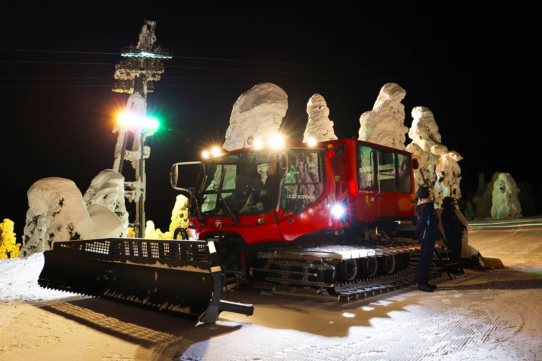 また、雪上車のナイトクルーザー号で行く「樹氷幻想回廊」ツアーも期間限定で行われています。蔵王ロープウェイの山麓線で樹氷高原駅へ、そこからナイトクルーザー号で山の中を進みます。途中、降車して樹氷を間近で観賞することもできる事前予約必須のアクティビティです。