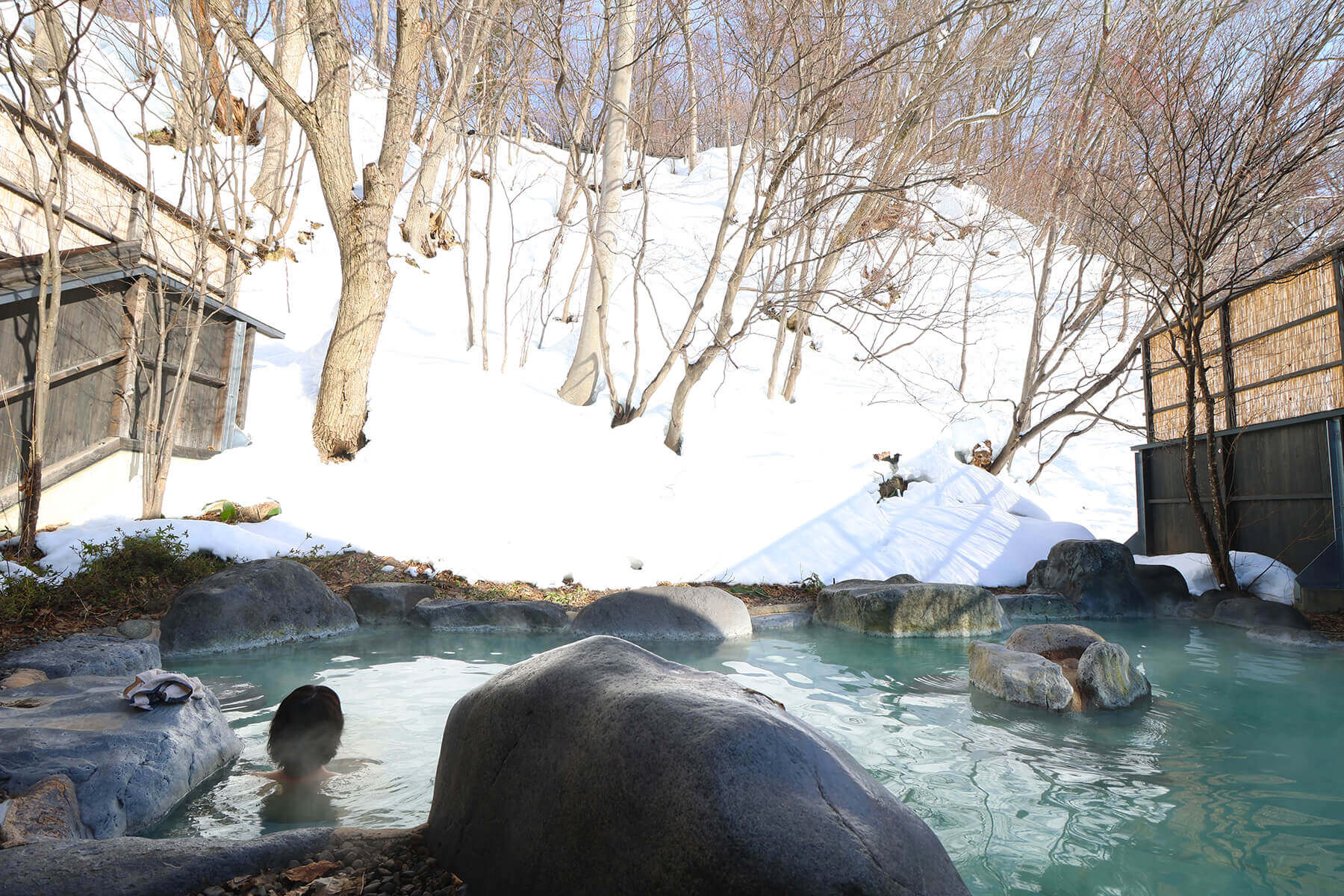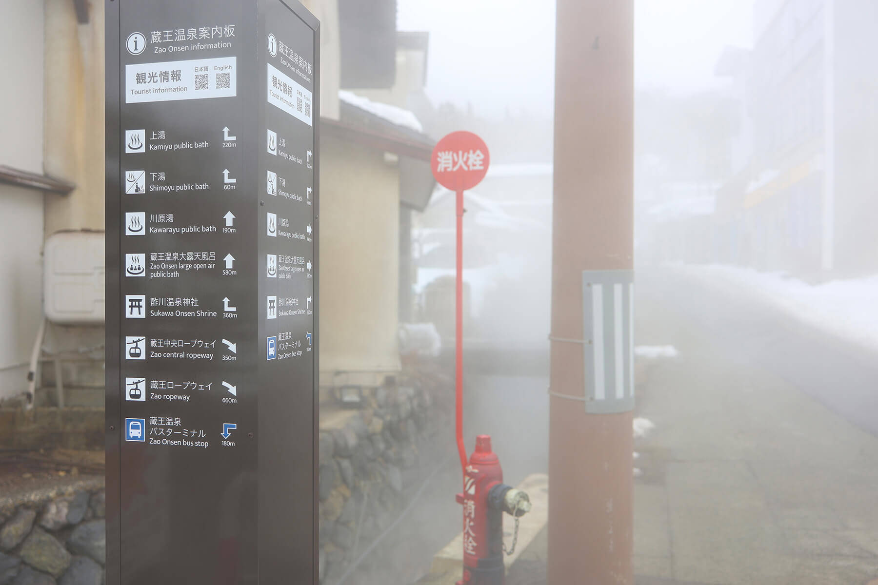 蔵王温泉スキー場から温泉街までは徒歩圏内です。蔵王温泉は1900年以上の歴史があり、温泉街を歩いているとそこかしこに湯けむりが漂っています。温泉と山水が混ざり合い、どんどんと音を立てて流れることから「どんどんびき」と呼ばれる見返り滝からも湯気が立ち上る様子が見られます。
