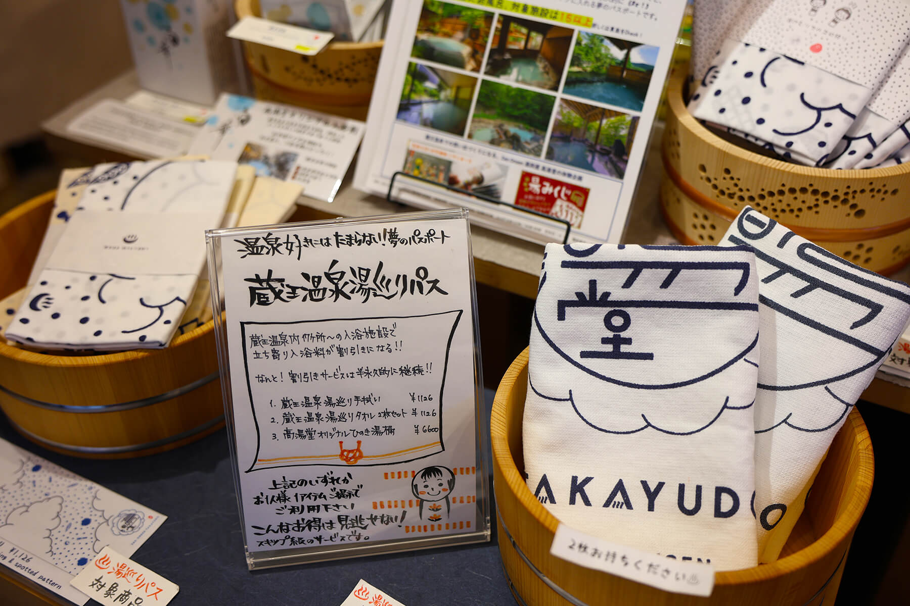 東北を中心に日本全国から集めた約300種の温泉アイテムがそろう「Zao Onsen 湯旅屋 高湯堂」では、タオルや手ぬぐいなどの湯巡りアイテムを買うと「蔵王温泉湯巡りパス」がもらえます。蔵王温泉内の約15ヵ所の入浴施設で立ち寄り湯が割引になり、何度でも利用できるのが魅力です。