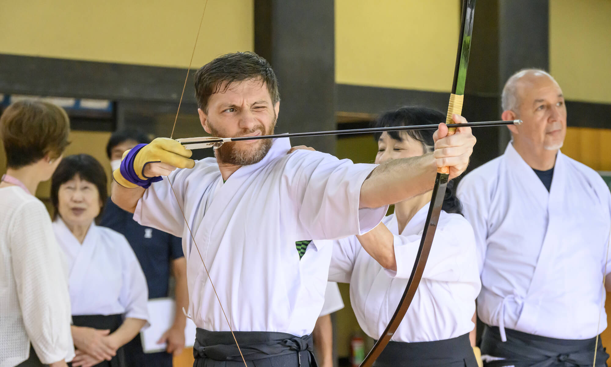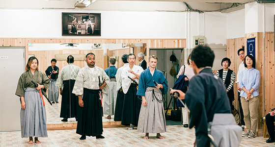 江戸時代(1603〜1868年)に「加賀百万石」と称された加賀藩は、将軍家・徳川家に次ぐ大藩(江戸時代、将軍より1万石以上の領地を与えられた大名の領地)でした。その歴史を受け継ぐ金沢には、金箔や加賀友禅をはじめとする工芸、能や芸妓文化をはじめとする芸能、茶の湯をはじめとする芸道などの武家文化が今も息づいており、様々な武道も体験ができます。石川県弓道連盟の全面協力のもと、大会でも使用される本格的な弓道場で、袴を着ての弓道体験。剣道7段の師範による剣道体験や侍が実際に所持していた刀剣の見学もできます。