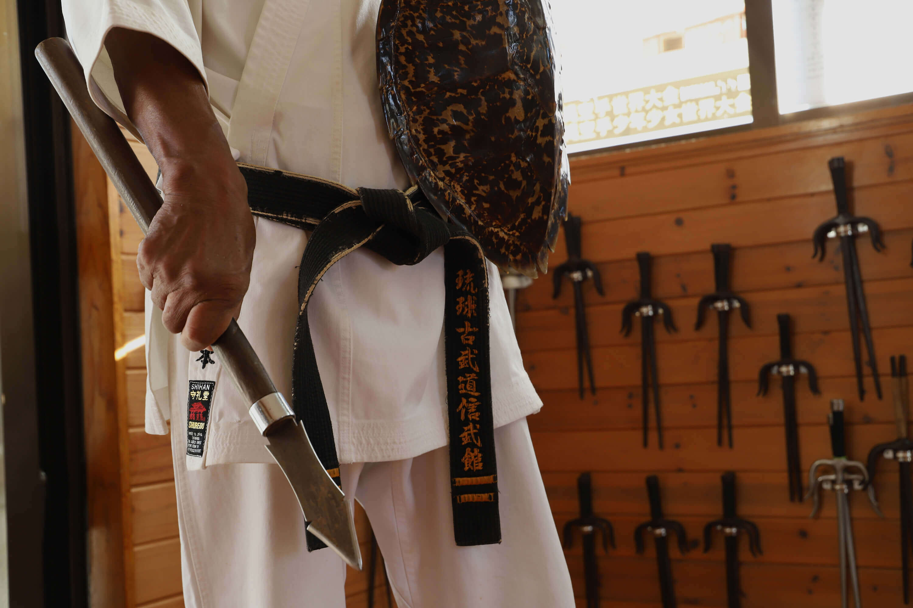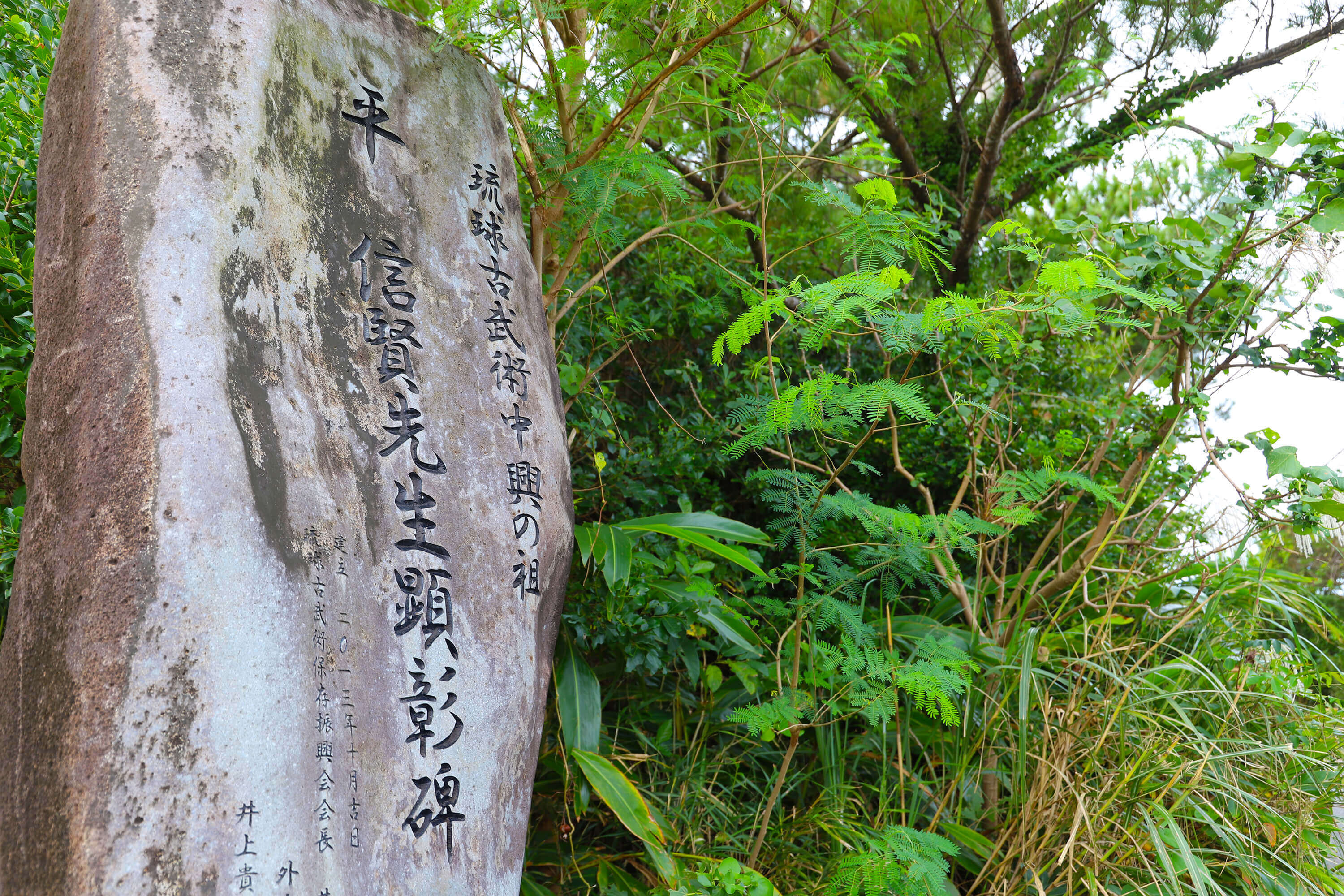 琉球古武道は様々な武具を用いて修練する沖縄古来の武器術で、これらの武器は日用品や農耕具などに由来し、攻防が一体した実践的な武器として使われるようになりました。棒やヌンチャクのほかにも、ティンベー(盾)とローチン(矛)で一対となる武具、短い棒に取っ手が付いた武具のトンファーなど、平信賢氏は沖縄に伝わる42種類の型を保持し、遺しました。久米島の登武那覇(とんなは)城跡近くには、平信賢氏の功績を伝える顕彰碑が建立されています。