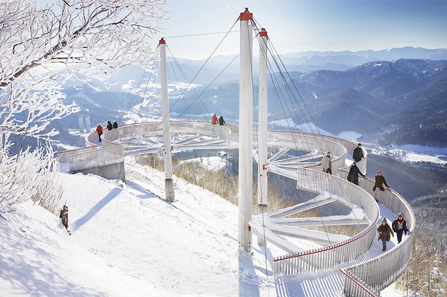 山麓からゴンドラを利用して標高1088mの霧氷テラスまでは約13分。誰でも行けるビュースポットで、水蒸気や霧が霧氷となって煌めく木々や雪に覆われた日高山脈の絶景が広がっています。そこから200mほど先の山腹には、雲の形をした展望デッキのCloud Walk(クラウドウォーク)や、バーカウンターをイメージしたCloud Bar(クラウドバー)があり、こちらも抜群の景観です。
