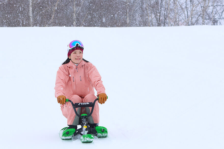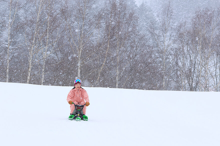 スキーやスノーボードだけでなく、トマムスキー場ではたくさんのスノーアクティビティを体験できます。特にハンドルやブレーキが付いた1人用ソリのスノーカートは、人気のアクティビティです。山頂から山麓のリゾートセンターまで全長約4200mのロングコースを、上手にブレーキを使いながら滑走。スキーヤーやスノーボーダーと同じようにゲレンデからの景色や斜面を滑り降りるスピード感を楽しむことができます。