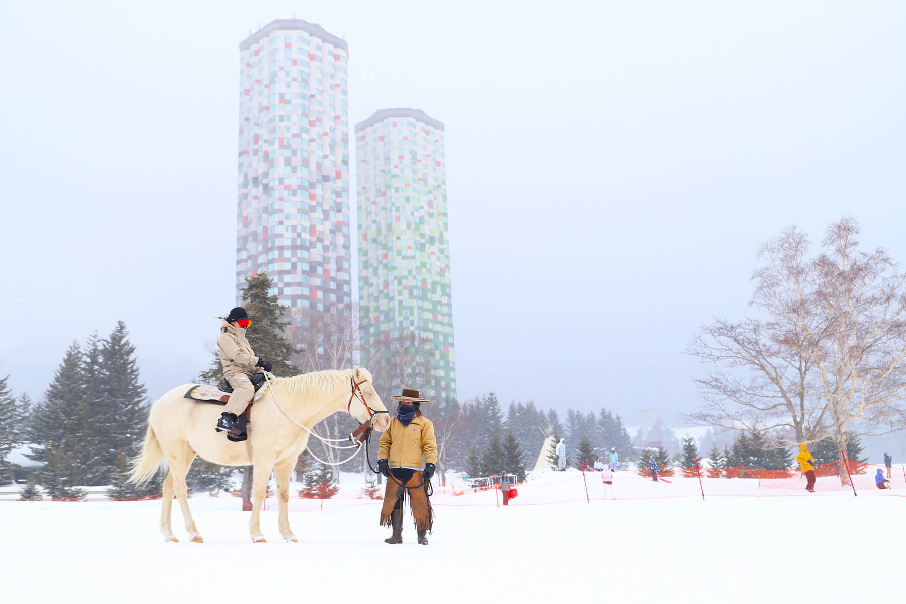 ほか、スタッフが先導する馬に乗って雪原を散策する乗馬体験、スノーシューやスノーモービル、スノーラフティングなど充実の内容です。