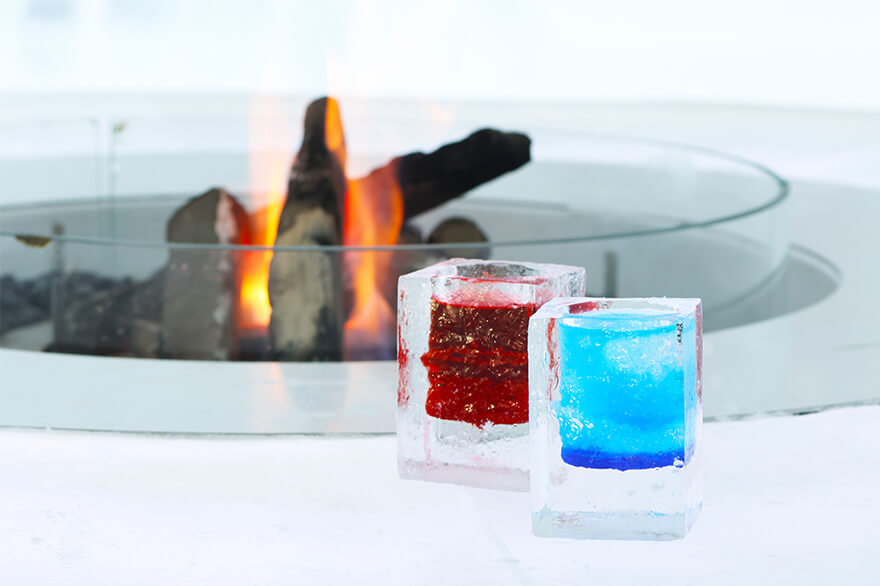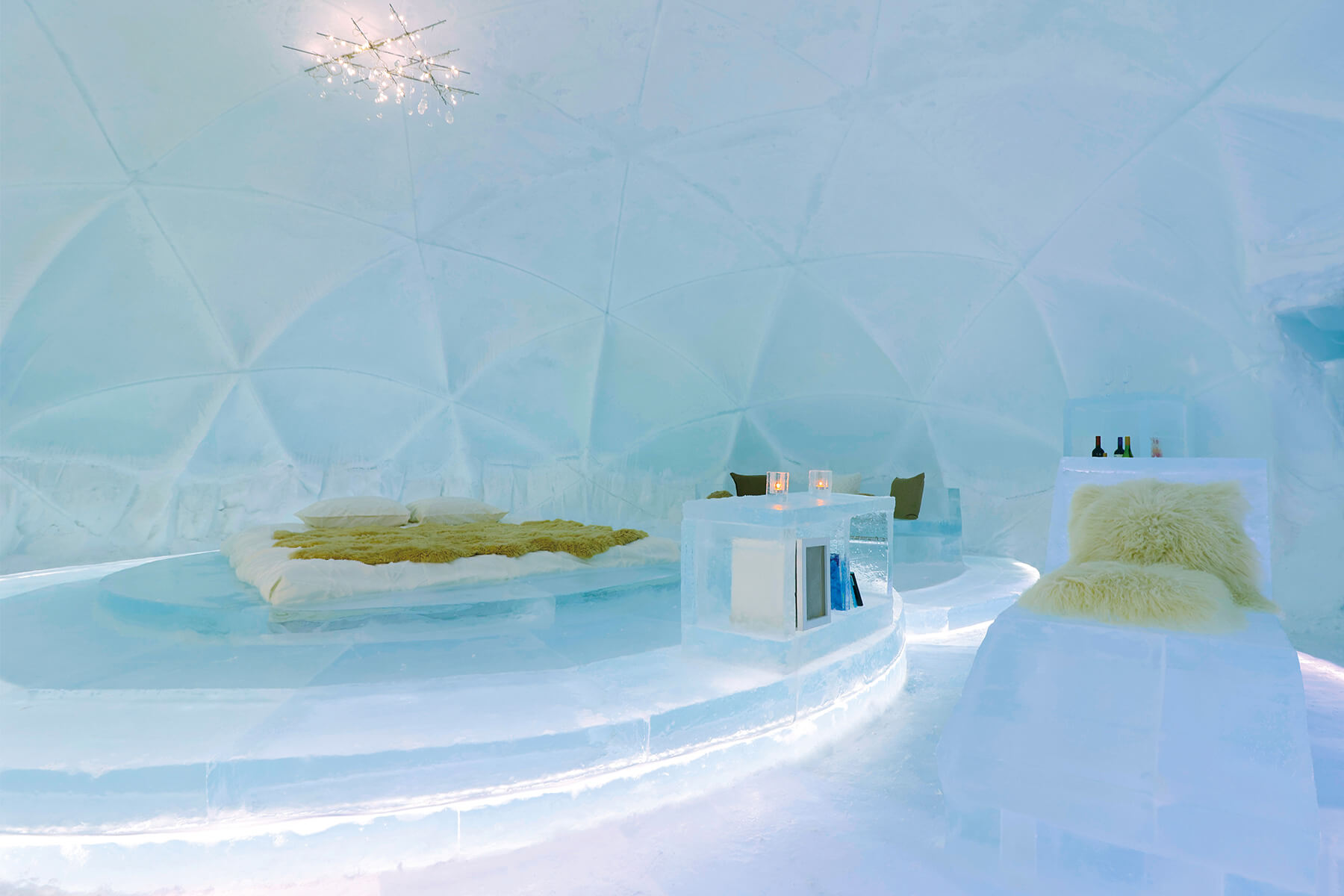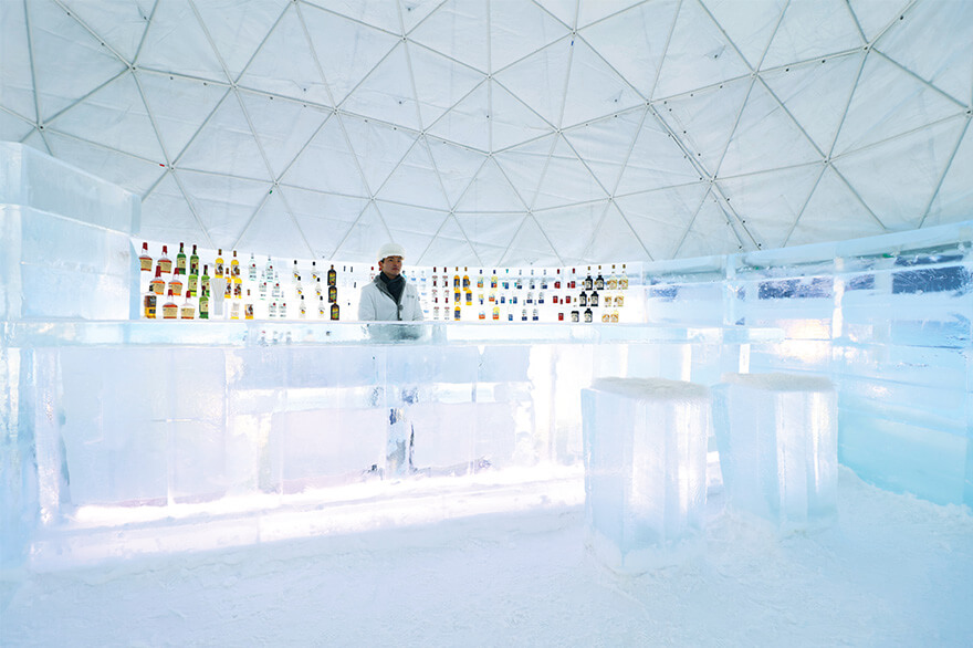 ベッドも棚も全て氷でできている「氷のホテル」は1日1組限定。宿泊体験者は湯船の周りを氷で囲んだ「氷の露天風呂」も利用できます。カウンターやイス、グラスまで氷でできている「氷のBar」は、50種類以上のお酒を提供。継ぎ目のない一枚氷で作られた「氷の教会」や、アイスリンク、氷の滑り台、氷や雪をテーマにしたショップやグルメなど、氷の世界を満喫できます。