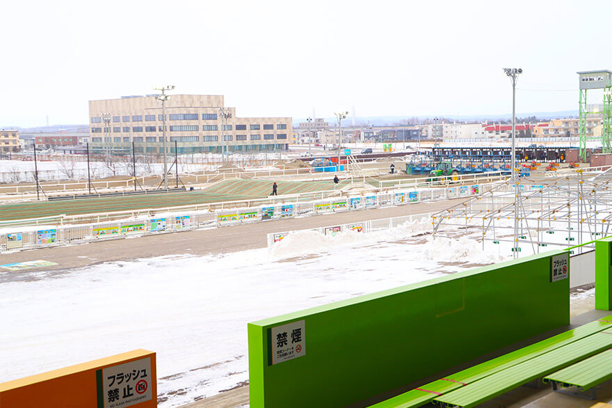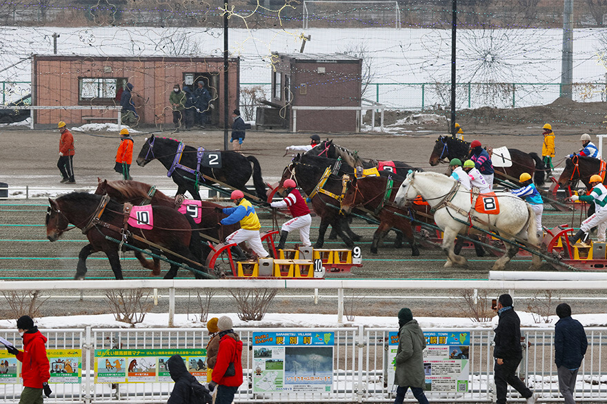 星野リゾート トマム スキー場から車で1時間ほどの距離にある帯広は、冬の北海道をもっと楽しみたいという人の立ち寄り先としておすすめのエリアです。帯広を代表する観光の見どころといえば、最大1tの鉄ソリを曳いて馬たちが競い合う世界で唯一の競馬「ばんえい競馬」です。幅1.8m×10のセパレートコースは直線200m。サラブレッドの約2倍もある体重1t前後の馬たちが、スピードとパワーを競いゴールを目指します。冬の間でも大きな体で懸命に走る馬たちの姿を、観戦スタンドからだけでなく、近くで並走しながら応援できるのもこの競馬場の魅力です。