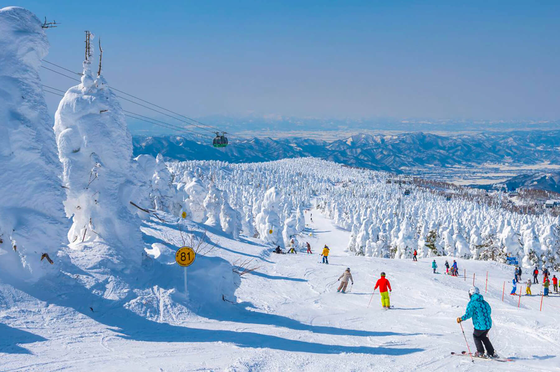 新幹線の停車駅・山形駅から蔵王温泉バスターミナルまでバスで約40分。そこから歩いていける距離にありアクセス良好な蔵王温泉スキー場は、総滑走面積127.22ヘクタール、最大滑走距離約10キロの東北最大級のスノーリゾートです。樹氷原を滑走できるなど変化に富んだ14のゲレンデと12のコースのうち初心者と中級者向けのコースが全体の80%を占めているので、それぞれのレベルに合わせてスキーやスノーボードを楽しむことができます。