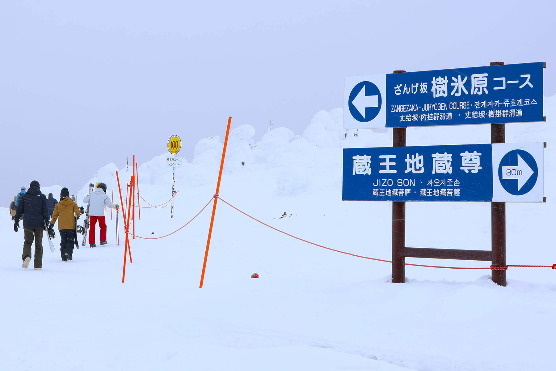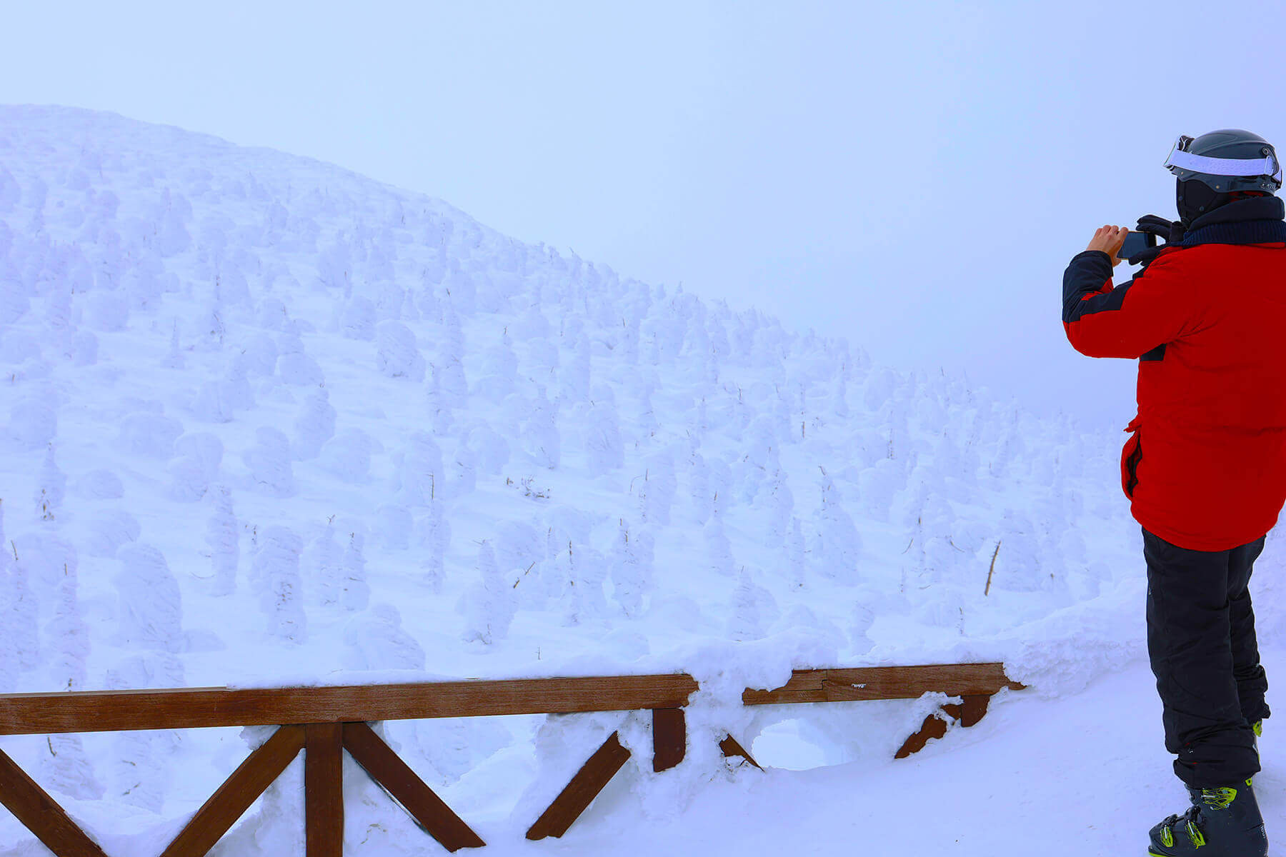 蔵王温泉スキー場で見逃せないのが樹氷の美しさです。この樹氷は、奥羽山脈の一部である蔵王連峰の特殊な気象条件と植生がつくり出した自然現象です。氷点下に水蒸気を多く含んだシベリアからの季節風が、蔵王連峰に自生する常緑針葉樹のアオモリトドマツに付着して凍りつき、大きく成長していきます。限られた地域でしか見ることのできないこの樹氷の見頃は1〜2月。蔵王ロープウェイの山麓線と山頂線を乗り継いで地蔵山頂駅へ向かう途中、360度の樹氷群の大パノラマが望めます。山頂駅にある屋上展望台なども眺望スポットです。