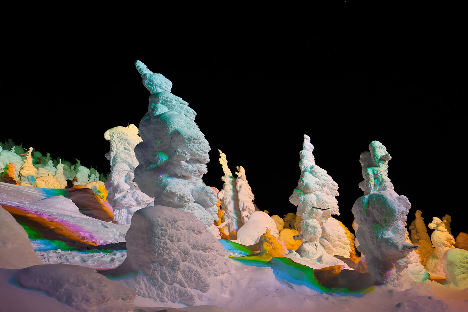 毎年、期間限定のイベントとして、樹氷のライトアップが行われています。暗闇の中、ライトに照らされて浮び上がる樹氷は幻想的で、昼間とは異なる姿を楽しめます。
