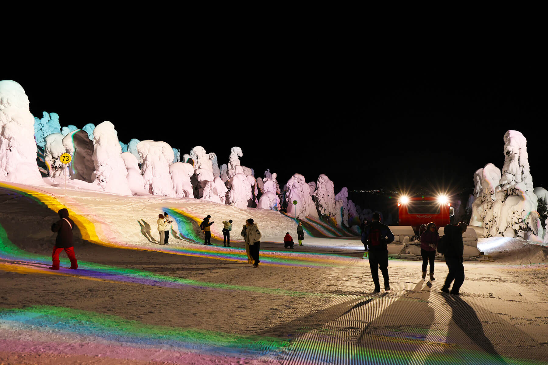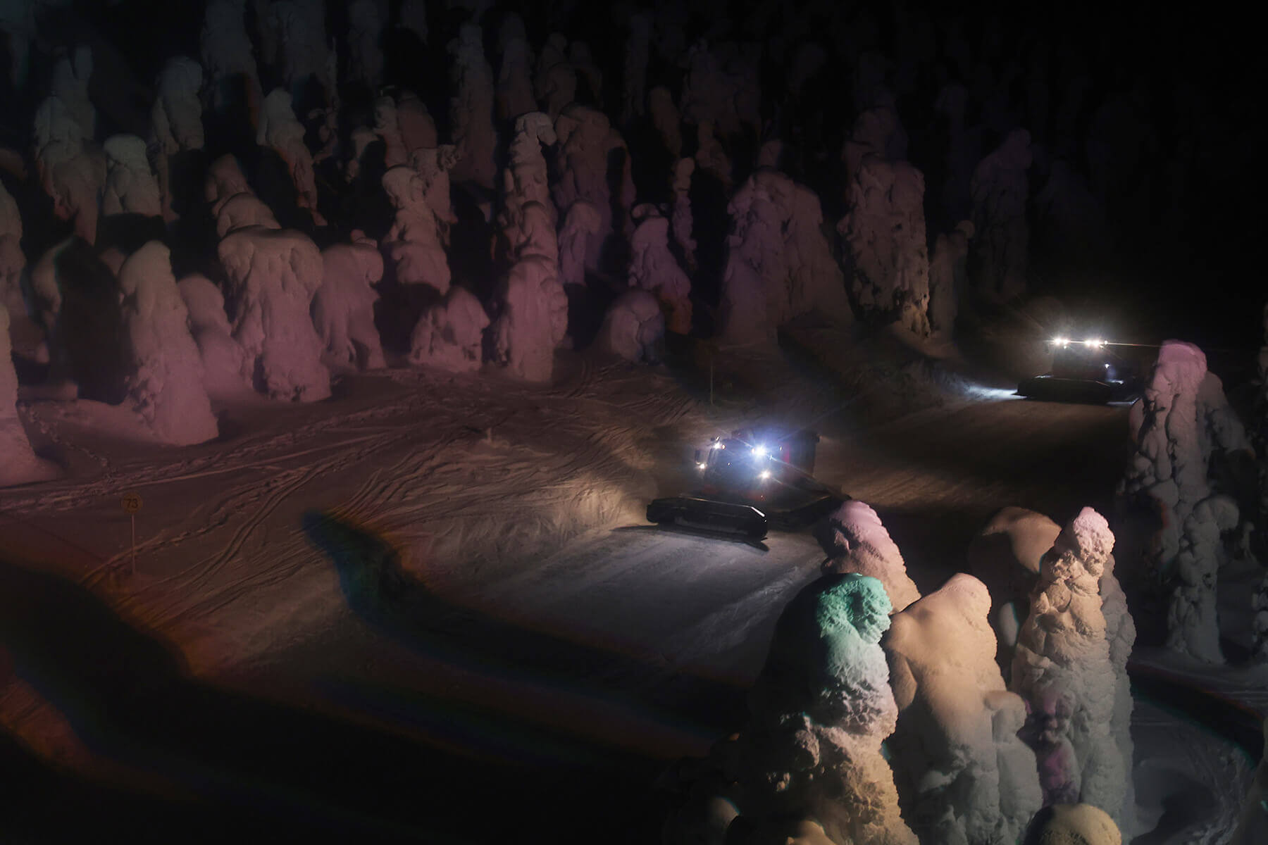 また、雪上車のナイトクルーザー号で行く「樹氷幻想回廊」ツアーも期間限定で行われています。蔵王ロープウェイの山麓線で樹氷高原駅へ、そこからナイトクルーザー号で山の中を進みます。途中、降車して樹氷を間近で観賞することもできる事前予約必須のアクティビティです。