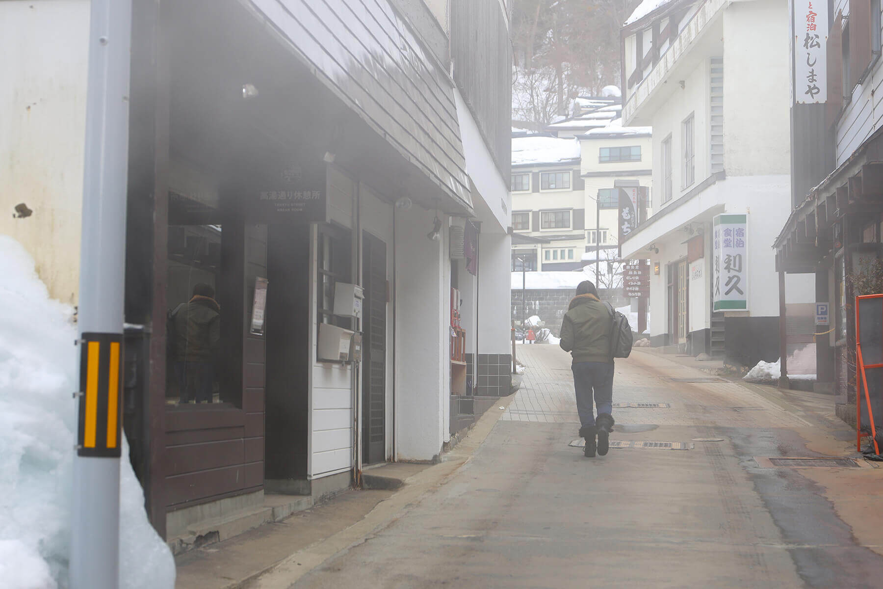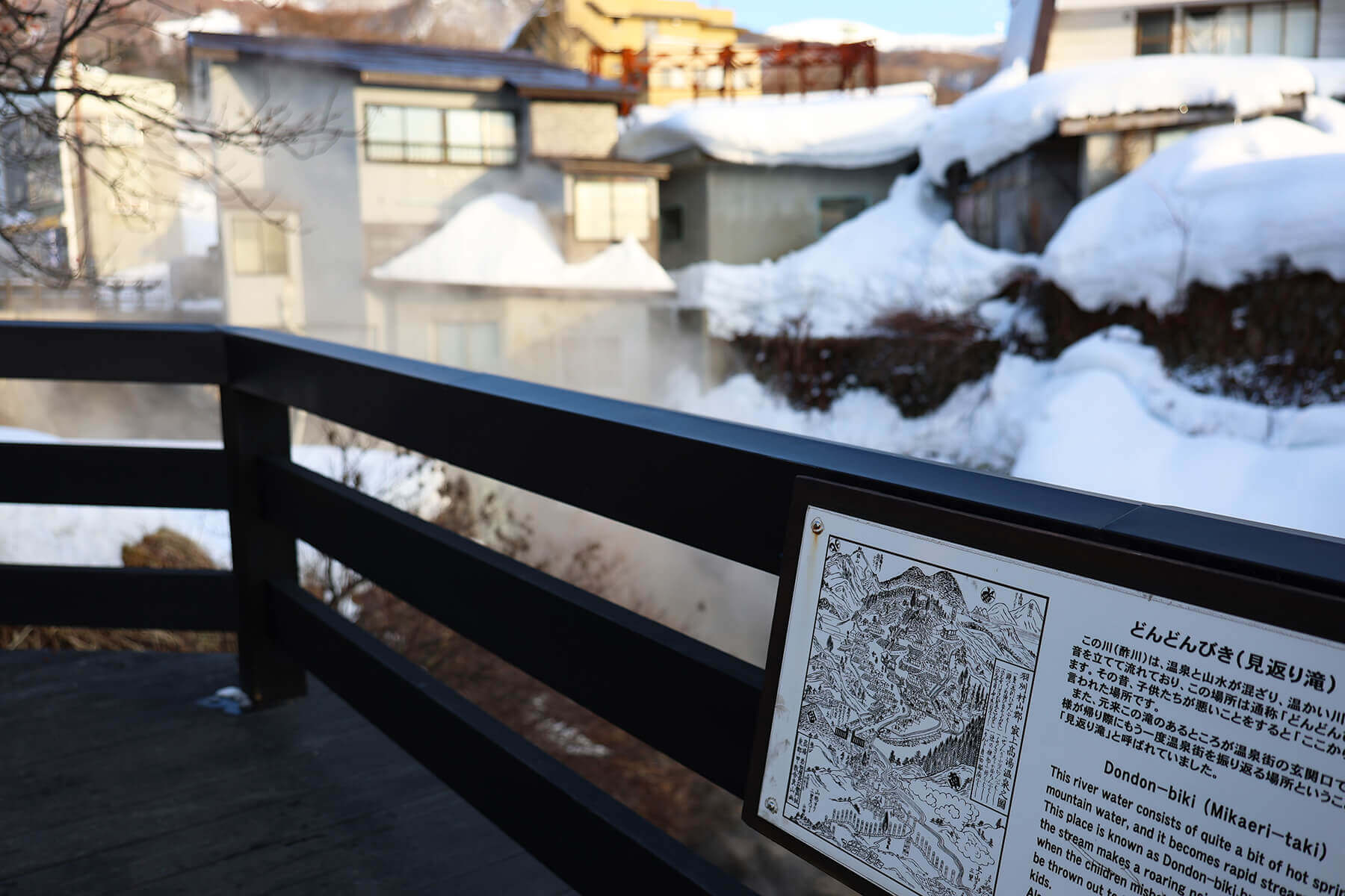 蔵王温泉スキー場から温泉街までは徒歩圏内です。蔵王温泉は1900年以上の歴史があり、温泉街を歩いているとそこかしこに湯けむりが漂っています。温泉と山水が混ざり合い、どんどんと音を立てて流れることから「どんどんびき」と呼ばれる見返り滝からも湯気が立ち上る様子が見られます。