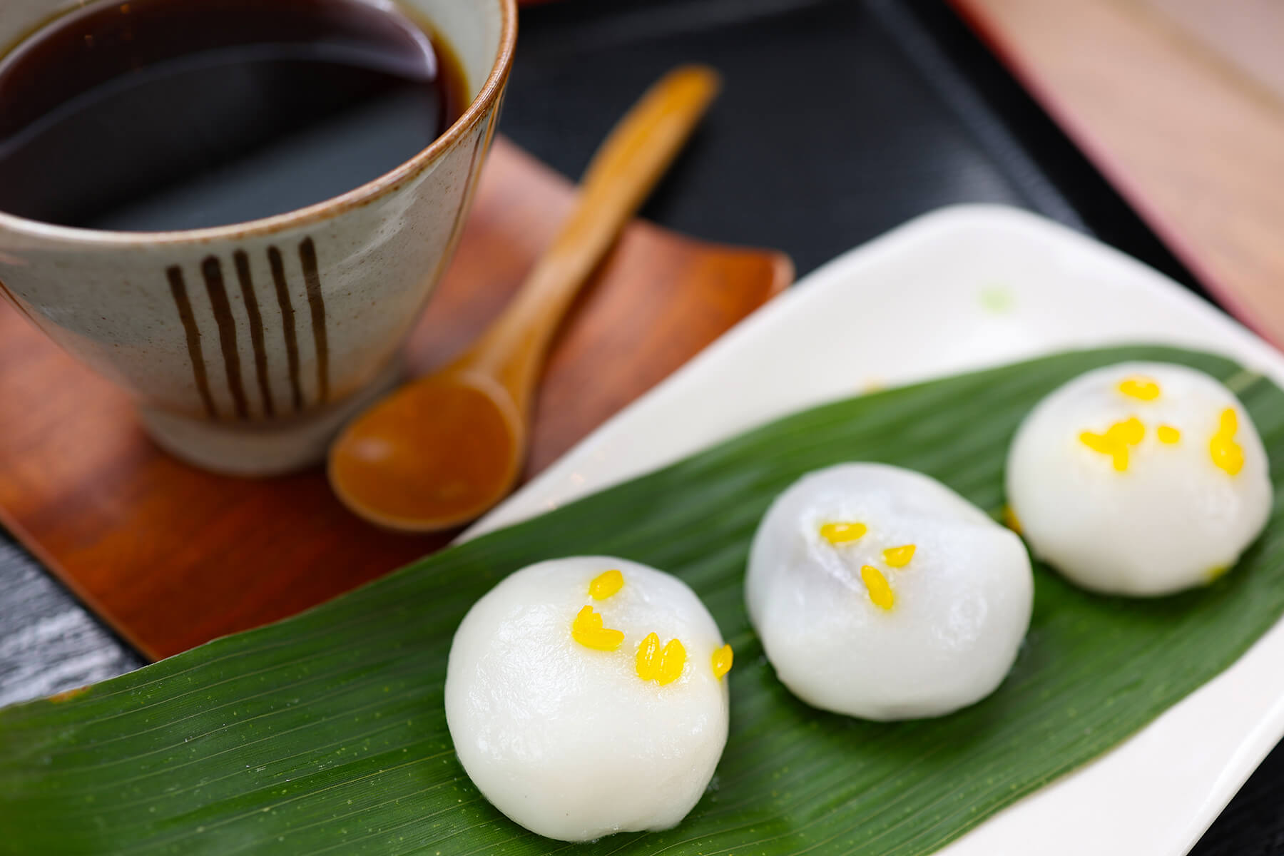 稲花(いが)餅は古くから蔵王に伝わる郷土菓子で、笹の葉は蔵王で採れた天然の隈笹の葉を使っています。米粉の餡入り餅の上には、稲の穂をイメージし黄色く染めたお米が乗っていて、そのまま笹ごと口元まで持っていって食べると、手をよごさずに笹の香りと風味が最後まで楽しめます。喫茶店「いがもちの里さんべ」では、コーヒーや抹茶などのドリンクと共にできたての稲花餅が楽しめ、こし餡は甘さ控えめで上品な味わいです。